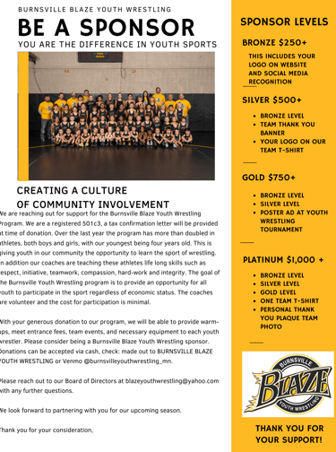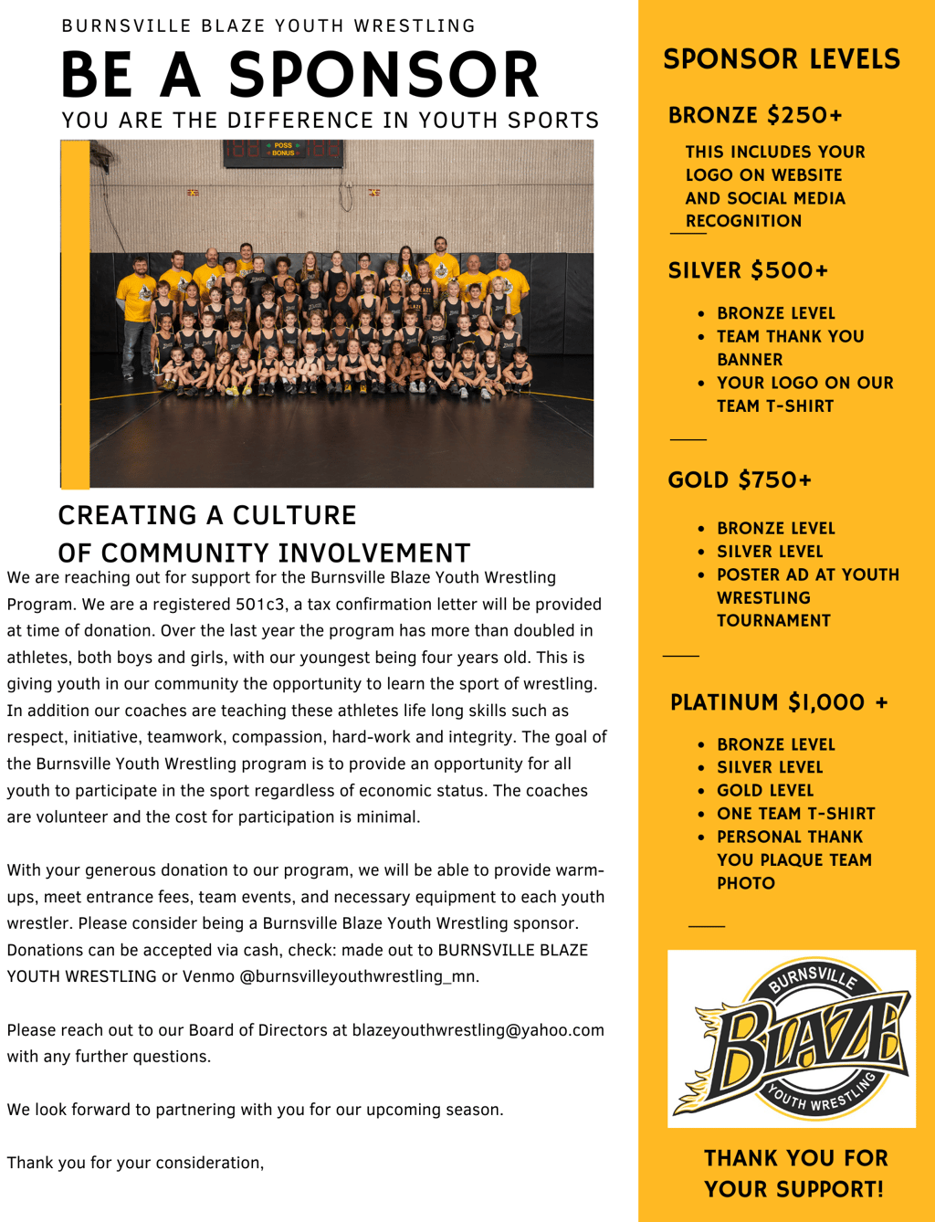 If you are interested in becoming a sponsor of Blaze Youth Wrestling, please go to the bottom of this section for more information.