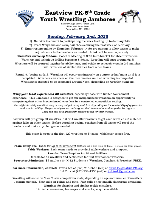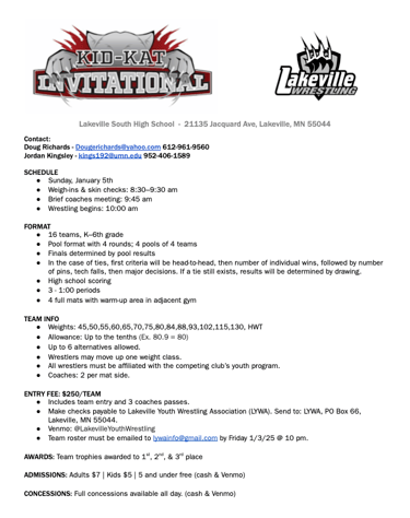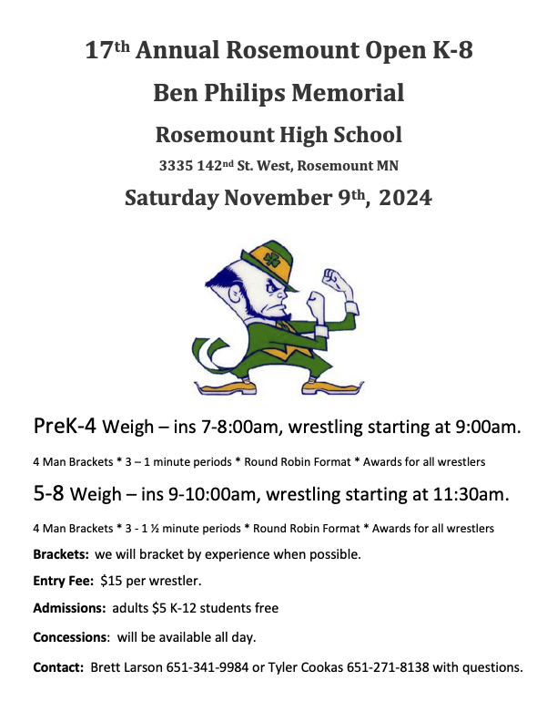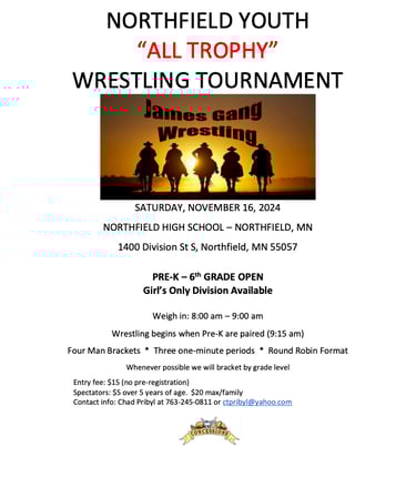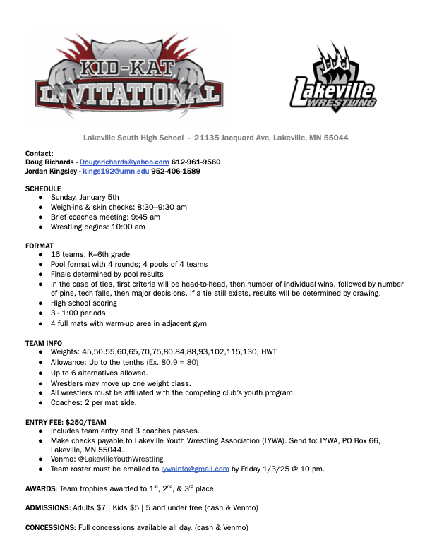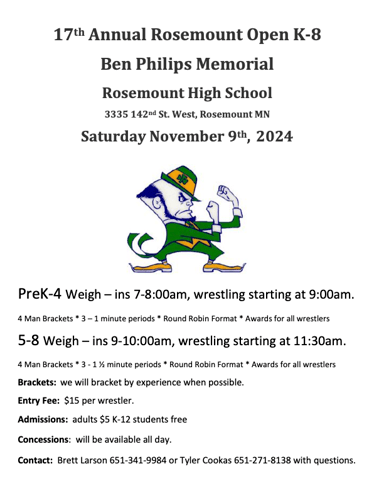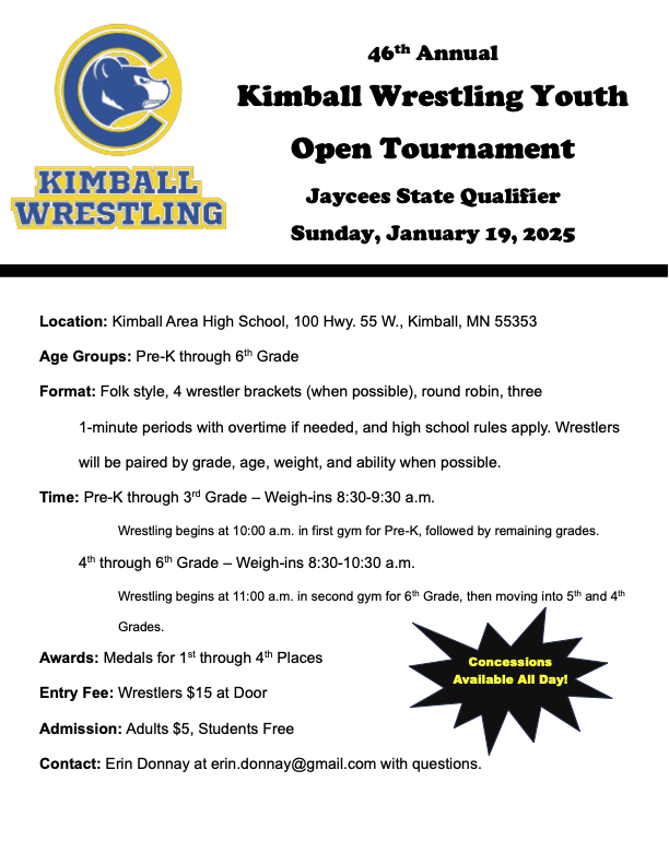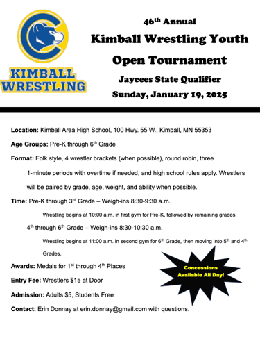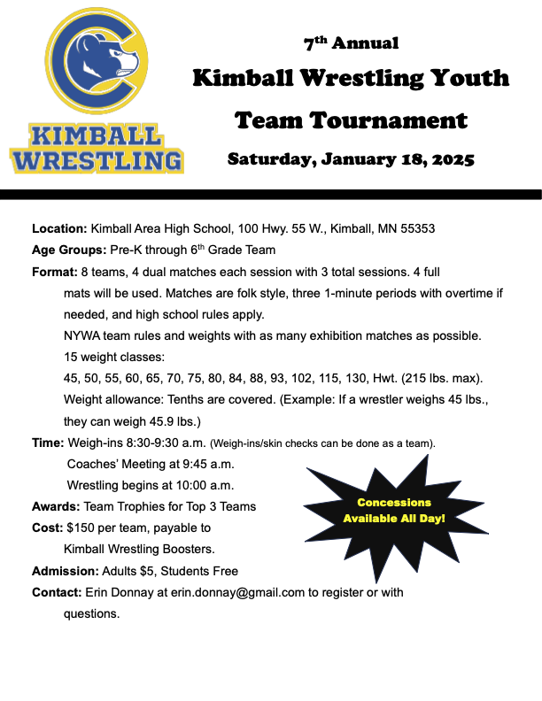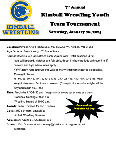 This year we will be traveling to Kimball for our overnight. The team tournament is on Saturday and the open tournament is on Sunday. For those of you new to the team or for those who did not go last year. This is without a doubt the most fun you will have all season. The kids and parents all had a blast and cannot wait for this year. Please make sure to mark your calendars and reserve the weekend for this. You and your wrestler will not regret it.