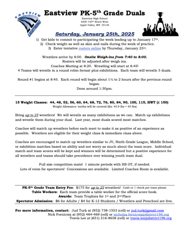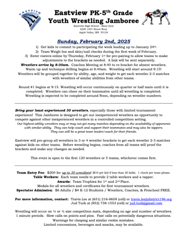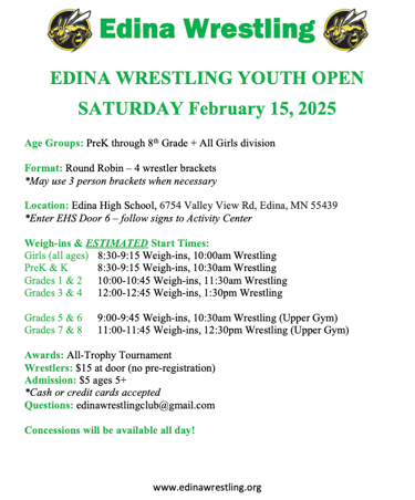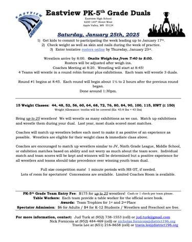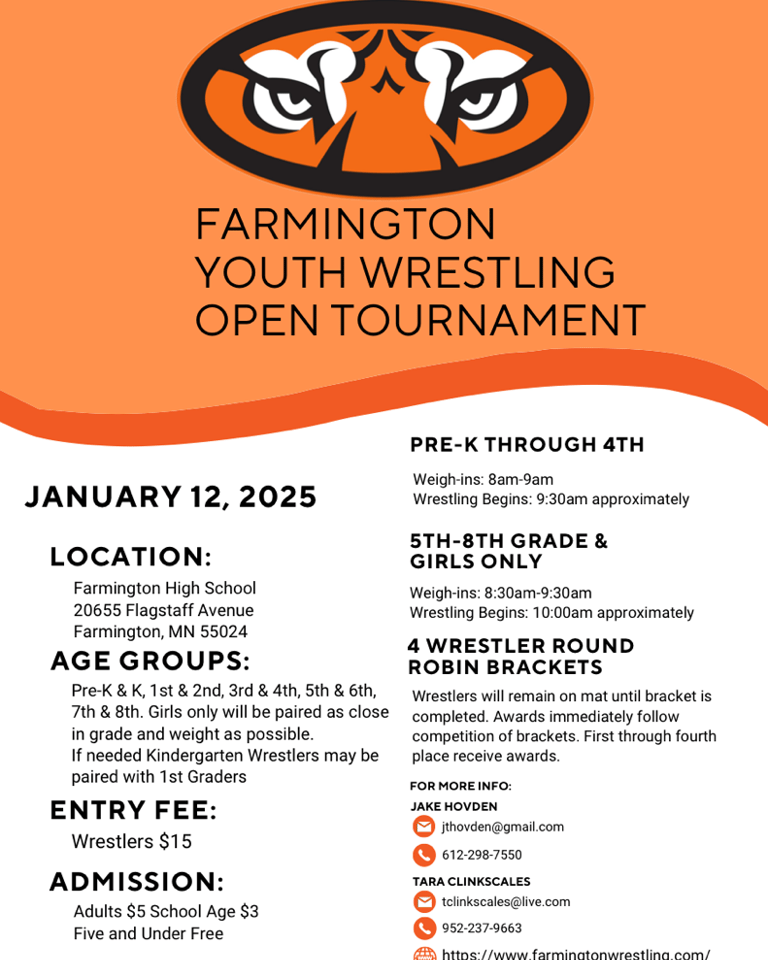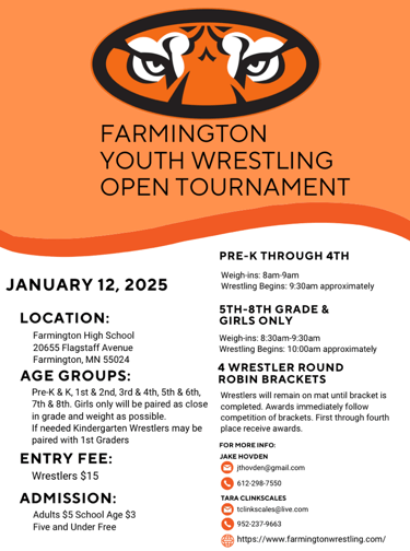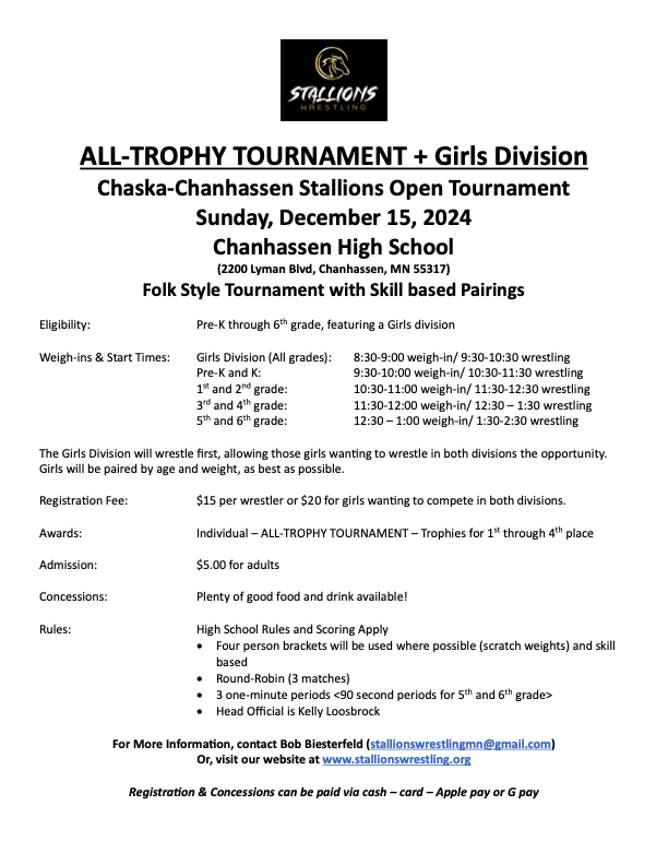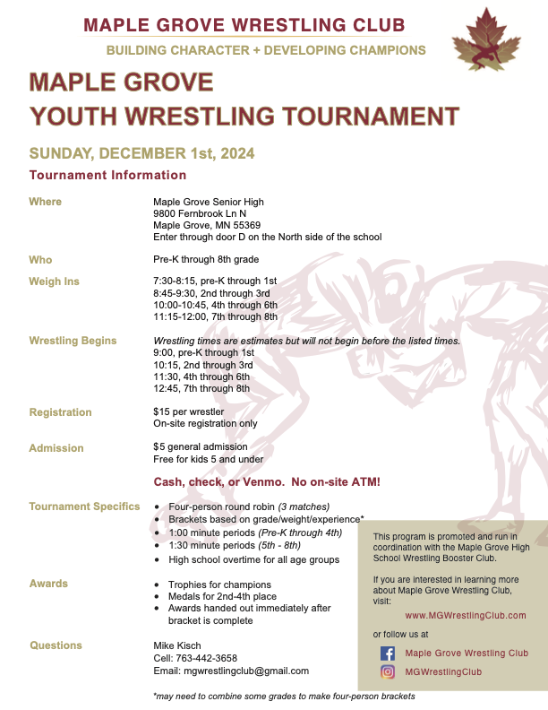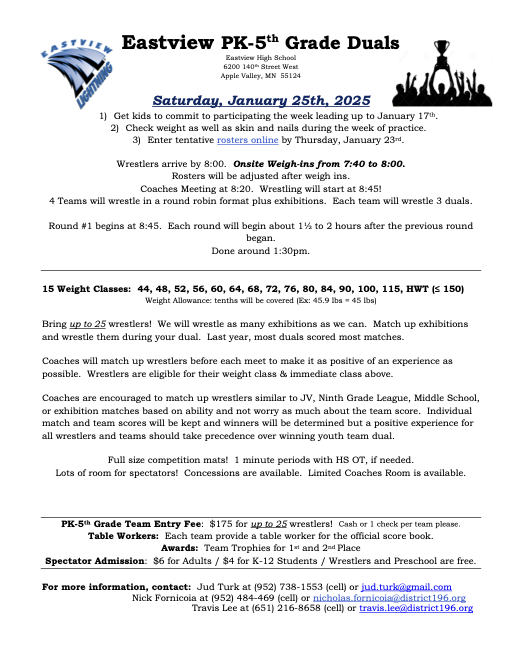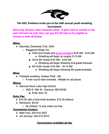 This year we will be traveling to Kimball for our overnight. The team tournament is on Saturday and the open tournament is on Sunday. For those of you new to the team or for those who did not go last year. This is without a doubt the most fun you will have all season. The kids and parents all had a blast and cannot wait for this year. Please make sure to mark your calendars and reserve the weekend for this. You and your wrestler will not regret it.